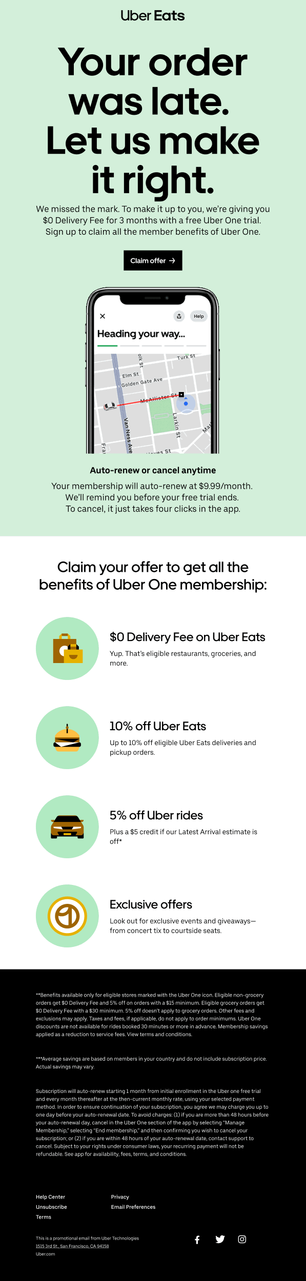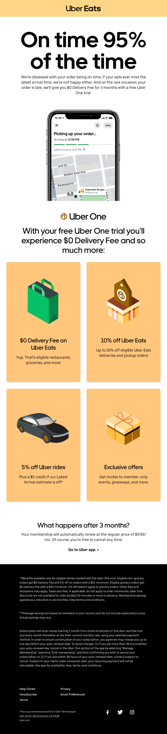 I designed brand marketing assets for the Uber Eats Reliability Campaign, focused on reinforcing trust in on-time delivery while clearly communicating Uber Eats’ promise to make it right if expectations weren’t met. The campaign also served as an educational touchpoint, highlighting the value and benefits of Uber One membership.